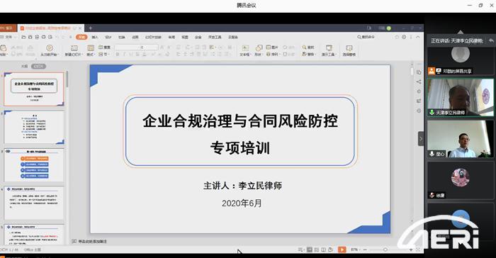 6月19日下午,中汽研(天津)汽車(chē)工程研究院有限公司(簡(jiǎn)稱(chēng)“工程院”)通過(guò)線(xiàn)上平臺組織了“企業(yè)合規治理與合同風(fēng)險防控”專(zhuān)題培訓。培訓特別邀請天津眾磊律師事務(wù)所李立民律師做主講。工程院黨委委員、法務(wù)分管副院長(cháng)胡濟民,以及各部門(mén)風(fēng)險控制專(zhuān)員、項目經(jīng)理、業(yè)務(wù)骨干、市場(chǎng)經(jīng)理等90余人參加了本次培訓。