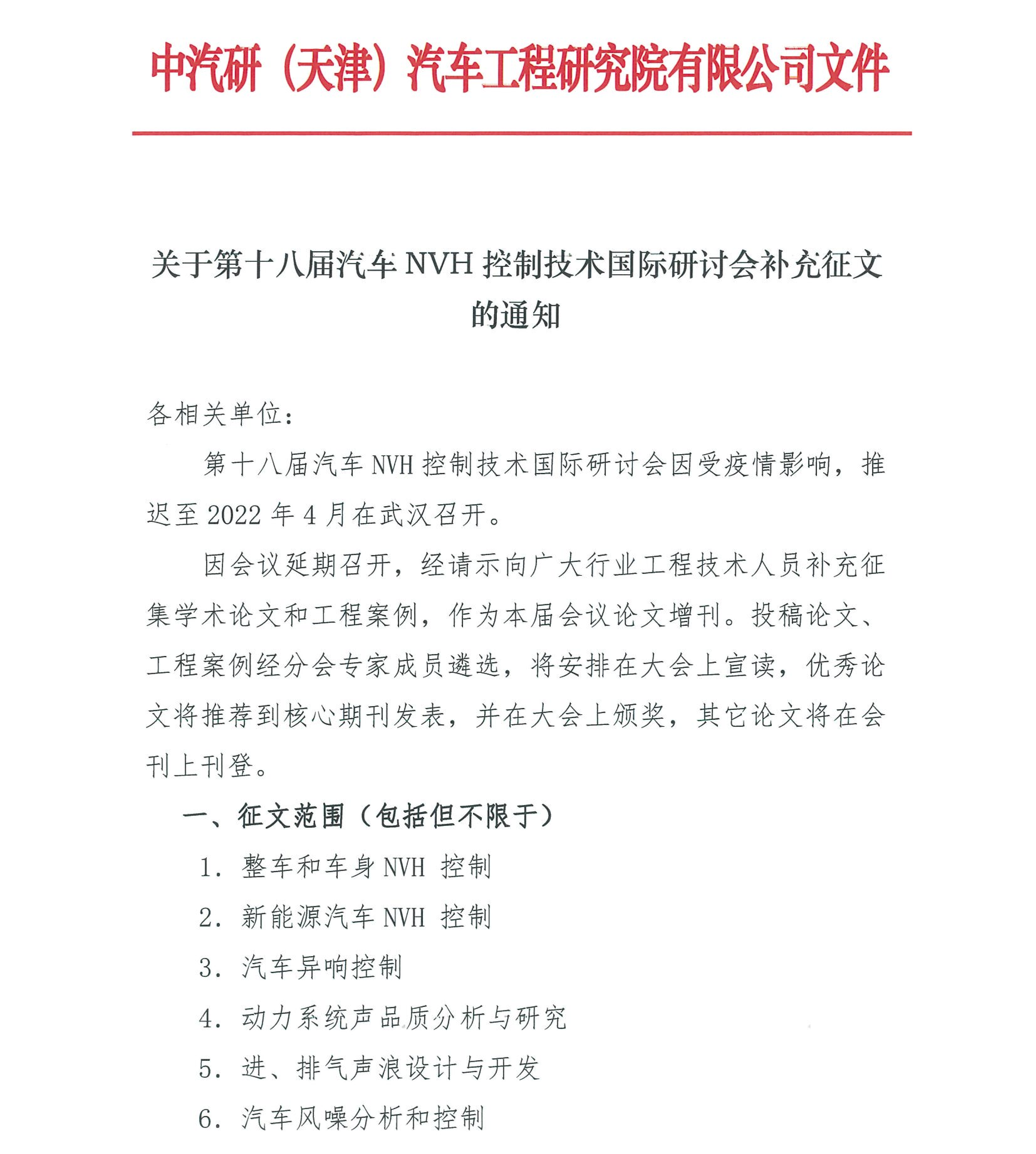 關(guān)于第十八屆汽車(chē)NVH控制技術(shù)國際研討會(huì )補充征文的通知
