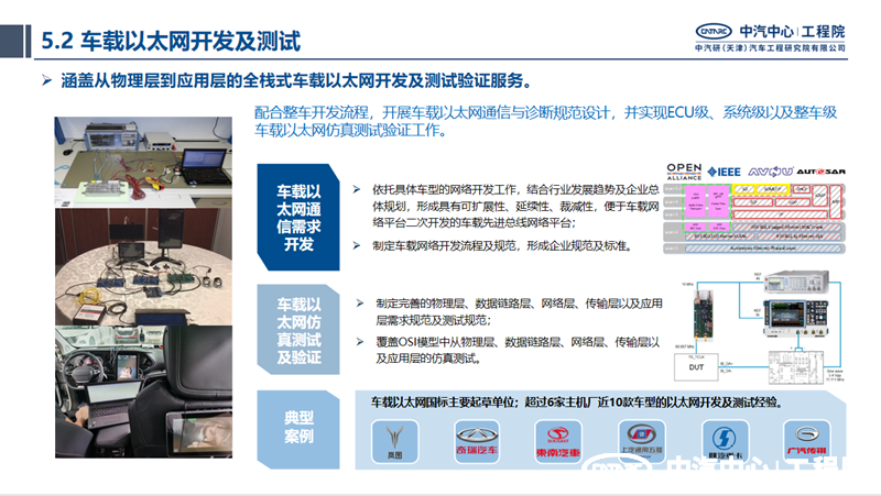 中汽中心工程院電子電氣架構與先進(jìn)總線(xiàn)團隊在車(chē)載以太網(wǎng)開(kāi)發(fā)及測試服務(wù)領(lǐng)域具有強大的技術(shù)實(shí)力和豐富的項目經(jīng)驗。團隊依托具體車(chē)型的網(wǎng)絡(luò )開(kāi)發(fā)工作,結合行業(yè)發(fā)展趨勢及企業(yè)總體規劃,形成具有可擴展性、延續性的企業(yè)規范及標準體系,形成便于二次開(kāi)發(fā)的車(chē)載先進(jìn)總線(xiàn)網(wǎng)絡(luò )平臺,制定車(chē)載以太網(wǎng)網(wǎng)絡(luò )開(kāi)發(fā)流程及規范。結合整車(chē)開(kāi)發(fā)流程,團隊制定完善的車(chē)載以太網(wǎng)物理層、數據鏈路層、網(wǎng)絡(luò )層、傳輸層以及應用層需求規范及測試規范,具備覆蓋OSI模型中從物理層、數據鏈路層、網(wǎng)絡(luò )層、傳輸層以及應用層的仿真測試能力,測試內容涵蓋物理層PMA和IOP測試、交換機性能測試、TC8協(xié)議一致性測試、AVB/TSN協(xié)議測試、基于DoIP的診斷協(xié)議測試、BT刷寫(xiě)測試以及路由測試等全棧式研發(fā)測試鏈。