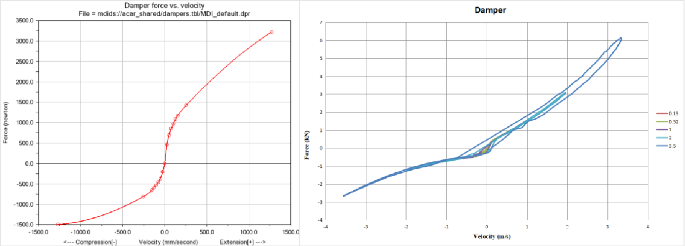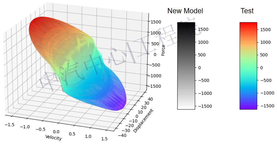 本次開(kāi)發(fā)的新的減振器模型則采用了全新的方法,可精準描述減振器在拉伸和壓縮時(shí)的滯環(huán)特性以及“位移-速度-力”之間的力學(xué)特性,模型精度可達95%以上。