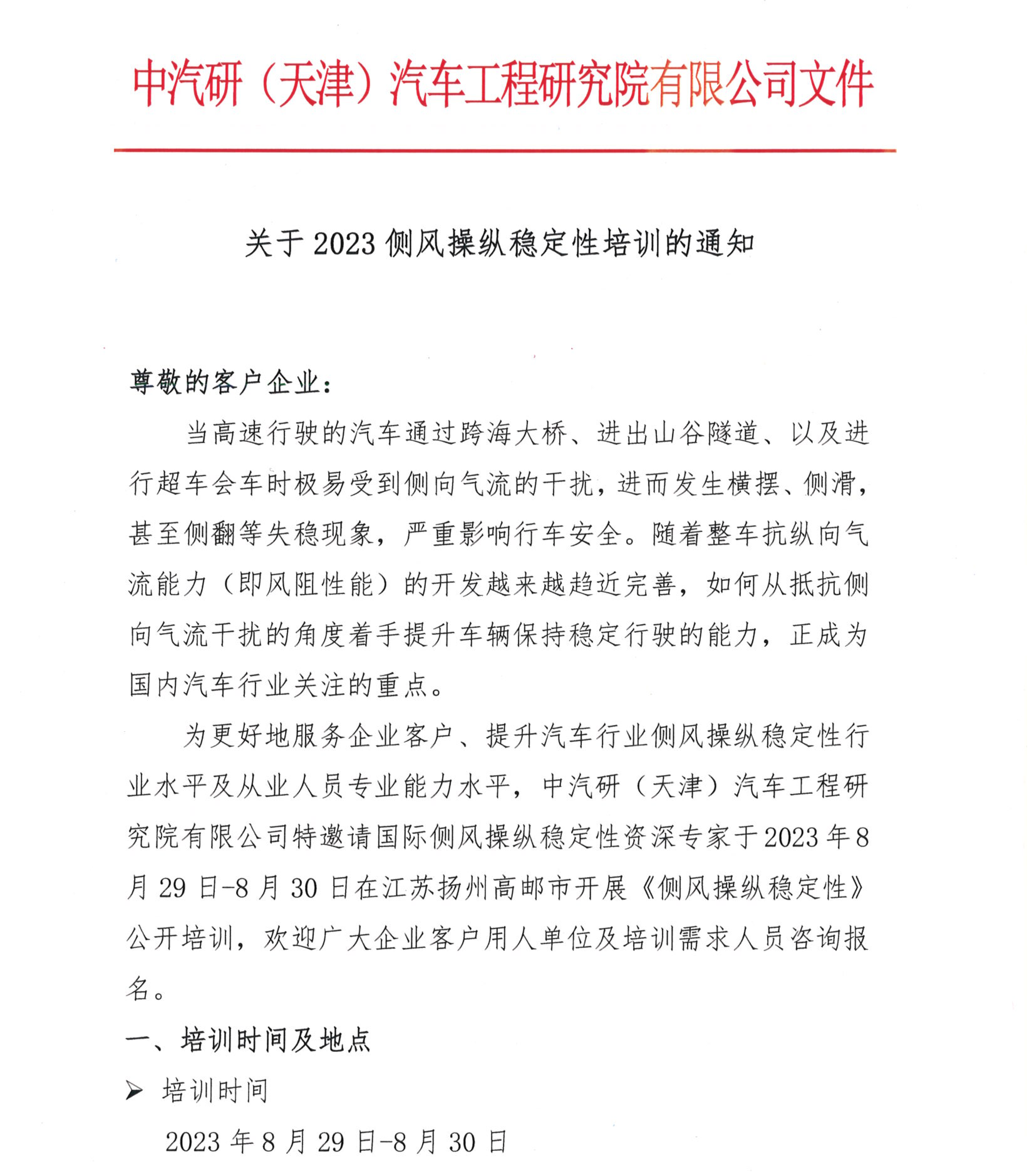 關(guān)于2023側風(fēng)操縱穩定性培訓的通知