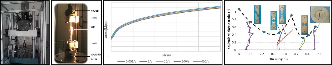 準確的材料參數是高精度蜂窩鋁仿真開(kāi)發(fā)的重要一環(huán),為得到蜂窩鋁結構的力學(xué)性能卡片,對蜂窩鋁所用鋁箔進(jìn)行不同缺口的料片試驗,得到應力應變參數曲線(xiàn),結合不同缺口的失效數據,得到基于GISSMO失效的應力應變三軸度曲線(xiàn),初步完成材料失效模型的開(kāi)發(fā)。