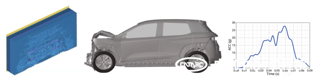 在工程實(shí)際應用中,FWDB有限元壁障可滿(mǎn)足車(chē)型的正面碰撞工況分析開(kāi)發(fā),性能表現穩定,可有效支持車(chē)體結構的仿真優(yōu)化,在設計階段發(fā)現潛在問(wèn)題,減少車(chē)型試制階段的工程試驗成本與設計變更。在某緊湊型SUV的仿真案例中,FWDB有限元壁障自身變形合理,車(chē)體前保蒙皮、防撞梁、吸能盒與縱梁等結構變形正常,整車(chē)B柱下加速度可支持后續約束系統模型分析。