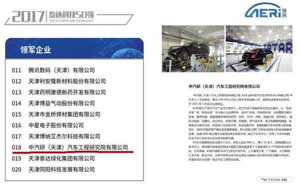 中汽研(天津)汽車(chē)工程研究院有限公司入選2017年度“泰達科技50強”企業(yè)