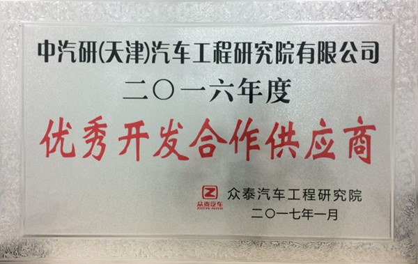 中汽中心汽車(chē)工程研究院被眾泰汽車(chē)評為“2016年度優(yōu)秀開(kāi)發(fā)合作供應商”
