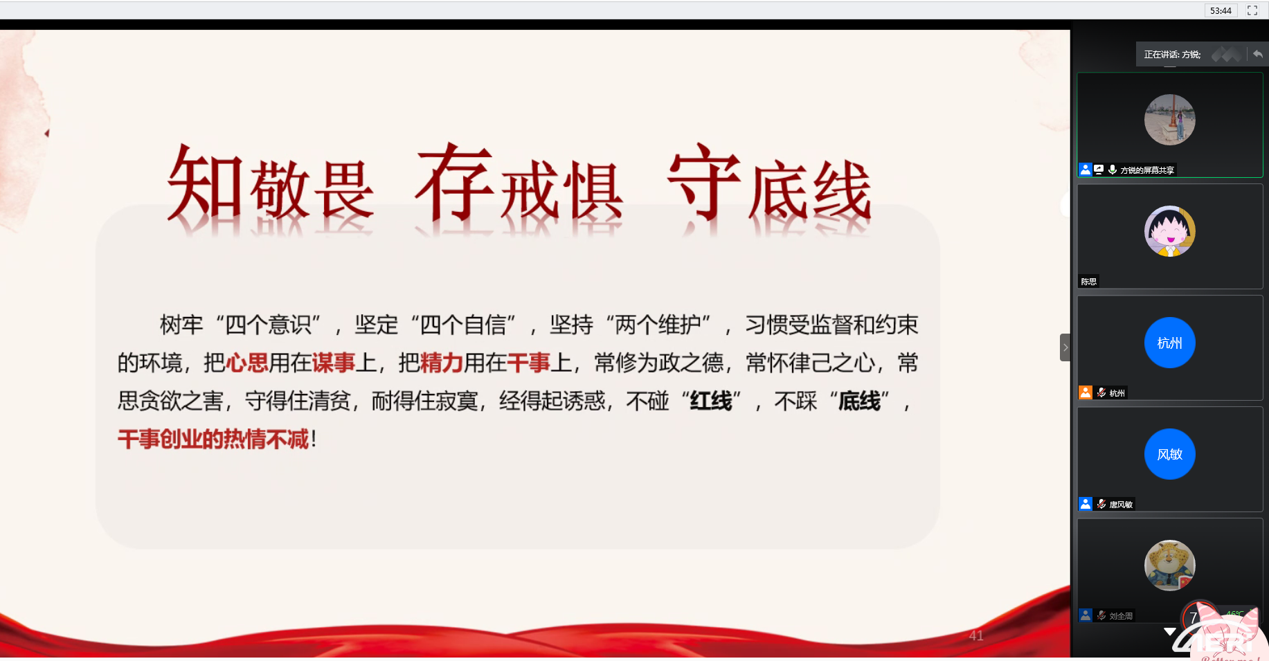 為落實(shí)全面從嚴治黨責任,營(yíng)造風(fēng)清氣正的政治生態(tài),加強黨員形勢任務(wù)教育,2020年6月22日,工程院黨委第五支部組織專(zhuān)題黨建活動(dòng),邀請工程院紀委委員方銳講授專(zhuān)題黨課,進(jìn)行端午節前廉潔提醒,并觀(guān)看紀錄片《偉大的抗美援朝》?;顒?dòng)由支部書(shū)記唐風(fēng)敏主持,43名黨員參加。
