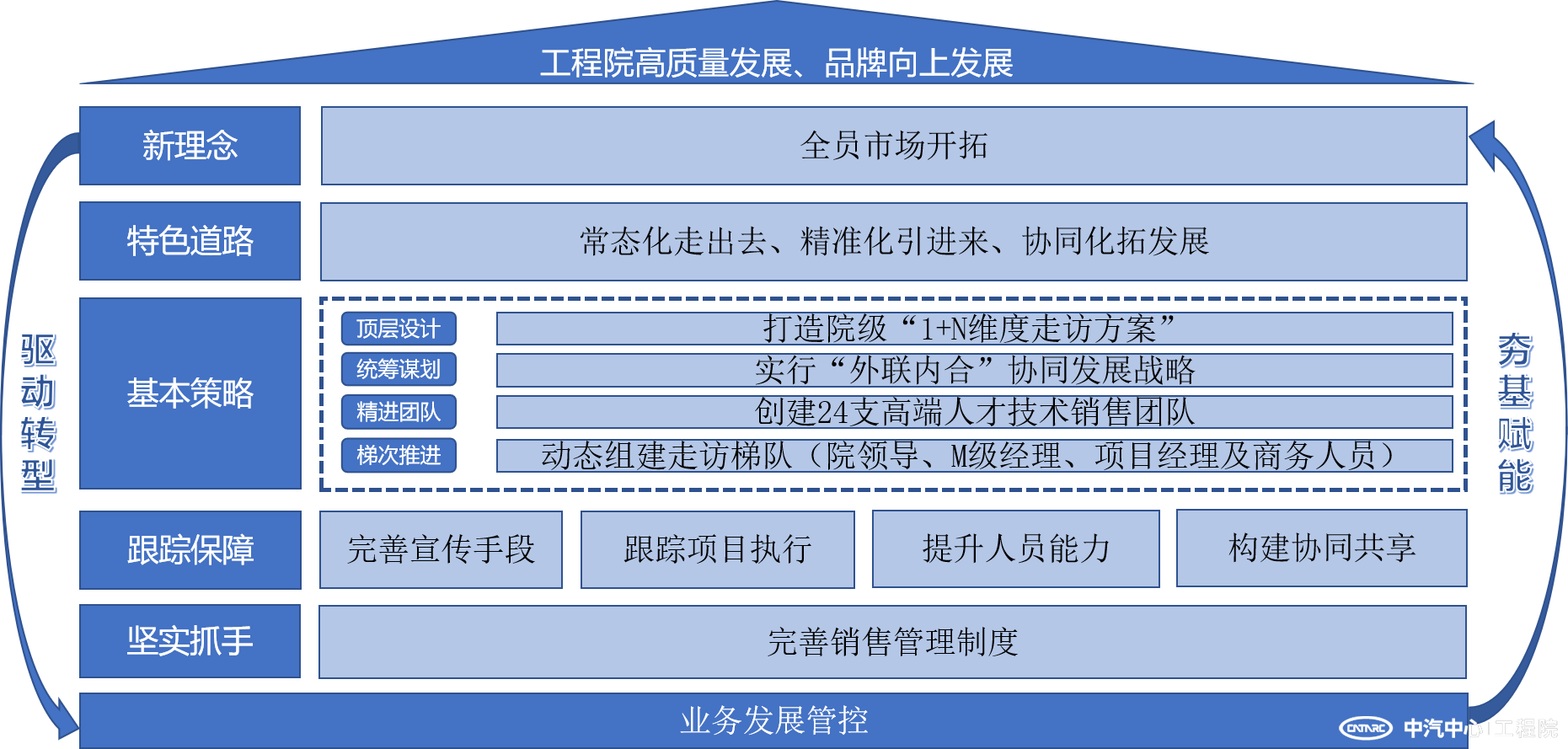 先鋒隊以實(shí)現“高質(zhì)量發(fā)展、品牌向上發(fā)展”為根本目標,確立了“全員市場(chǎng)開(kāi)拓”的全新理念,探索出“常態(tài)化走出去、精準化引進(jìn)來(lái)、協(xié)同化拓發(fā)展”的特色道路,確立了“頂層設計、統籌謀劃、精進(jìn)團隊、梯次推進(jìn)”四大類(lèi)基本策略,完善了“提升宣傳手段、跟蹤項目執行、提高人員能力、構建協(xié)同共享”的跟蹤保障機制,并以《銷(xiāo)售管理制度》為堅實(shí)抓手,明確管理職責、提高協(xié)同效率,指導各項環(huán)節落地,構筑起了市場(chǎng)開(kāi)拓的整體布局。